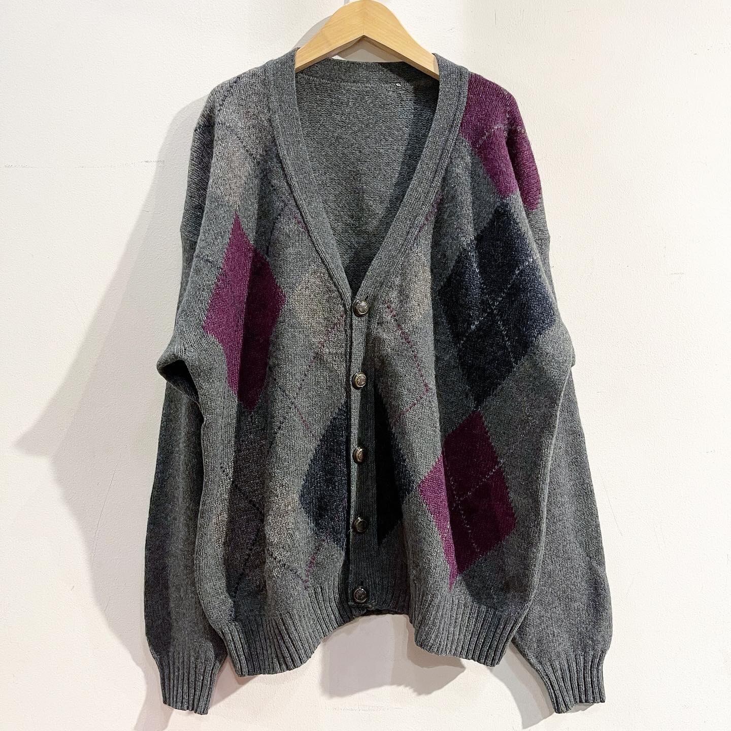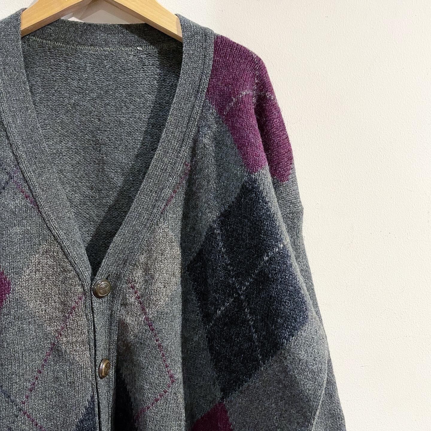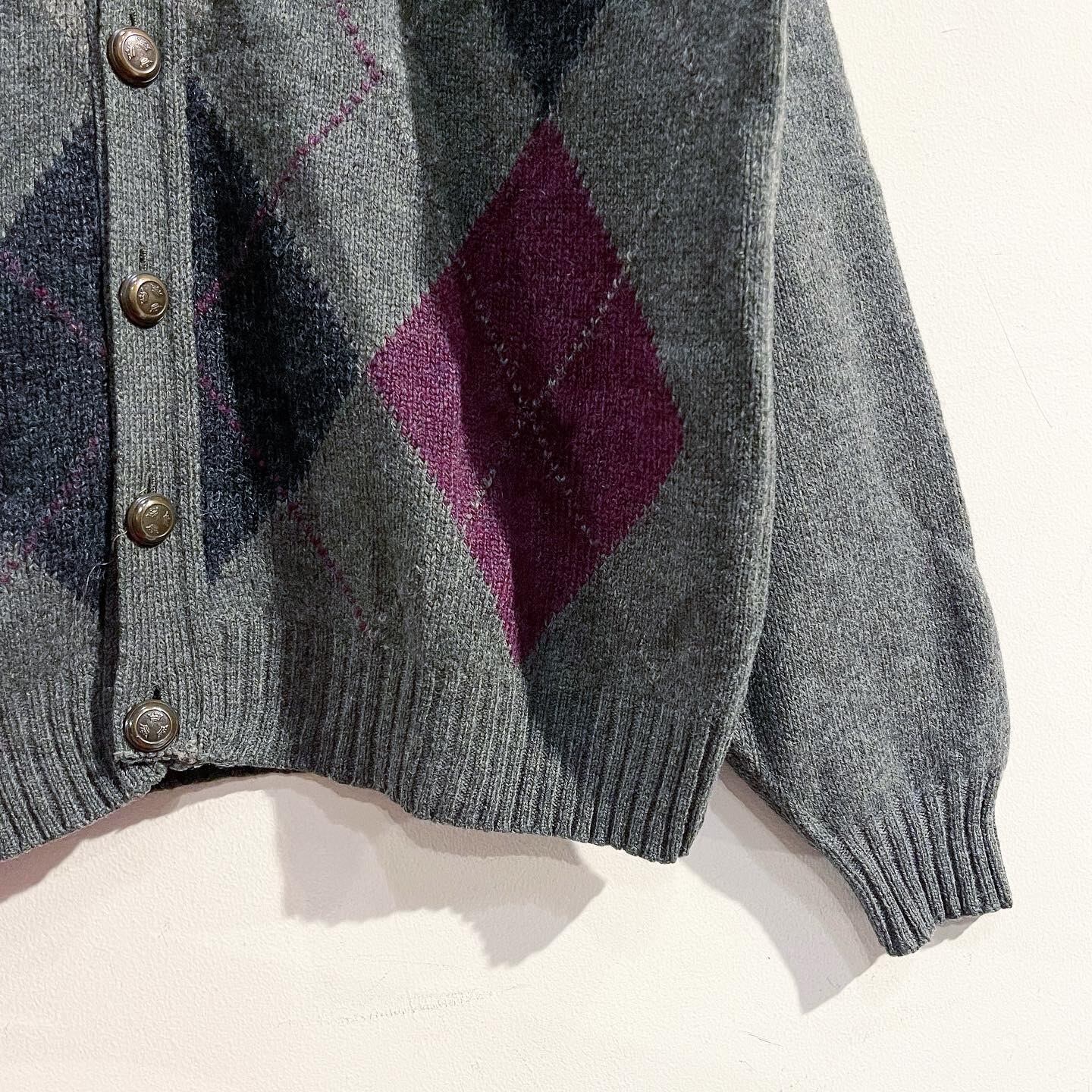 左右非対称のアーガイル柄のカーディガン。