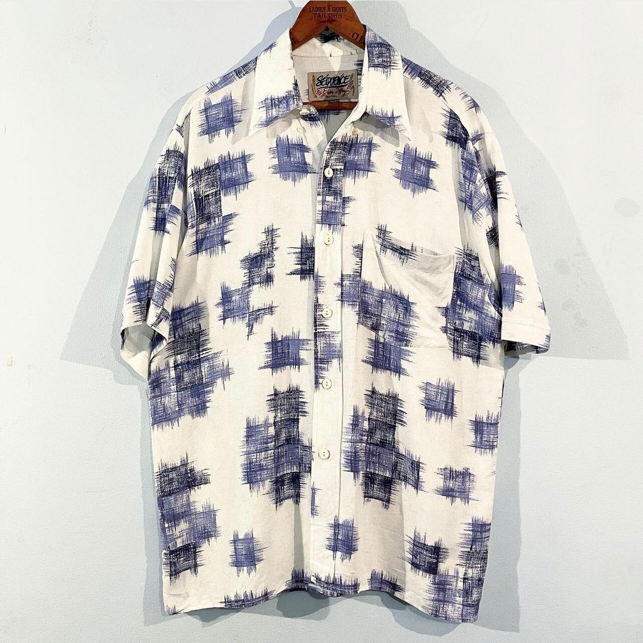 ホワイトベースにブルーのカスリ柄、男らしさ強めなデザインシャツ!